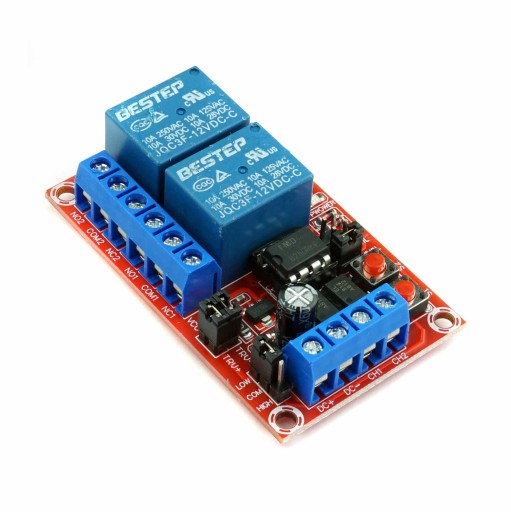 Przekaźnik bistabilny zmienia stan na przeciwny po każdym podaniu sygnału do modułu, dzięki temu nie ma potrzeby podawania sygnału cały czas jak ma to miejsce w standardowym przekaźniku - tutaj wystarczy krótki impuls. Przekaźniki mogą być sterowane stanem niskim lub wysokim w zależności jak ustawimy zworkę na płytce. Na PCB zintegrowane zostały 2 przyciski do sterowania każdym z kanałów, które działają tylko jeśli zworki są dla danego kanału ustawione sterowanie stanem niskim oraz diody led sygnalizujące zasilanie modułu i stan pracy dla każdego z kanałów osobna.