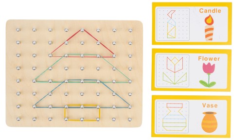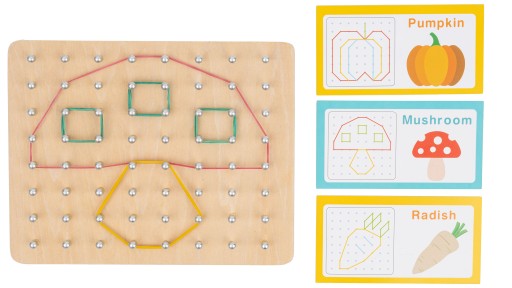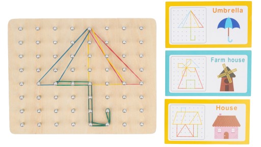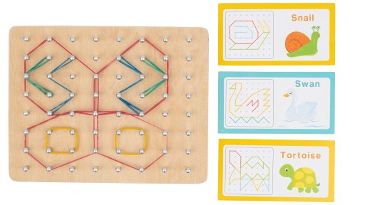 Ta fenomenalna drewniana układanka polega na tworzeniu określonych wzorów za pomocą gumek na specjalnej płytce. Prosta układanka sprzyja rozwijaniu logicznego myślenia, kreatywności oraz wspiera zdolności manualne.