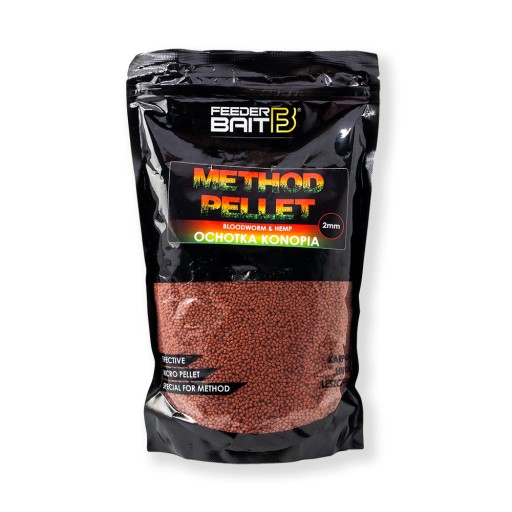 W pelletach Feeder Bait zastosowano technologię wolnego uwalniania. Struktura Pelletu została opracowana tak, by rozpadał się on warstwa po warstwie, stale uwalniając aromat. Po odpowiednim namoczeniu pellet dobrze trzyma się podajnika, co gwarantuje położenie pełnego zestawu na dnie; taka sytuacja nie wpływa jednak na szybkie obsypywanie się podajnika. Kulka po prawidłowym przygotowaniu pelletu zostaje uwolniona w niespełna dwie minuty, co rzutuje na liczbę złowionych ryb. Method Pellet firmy Feeder Bait występuje w trzech wersjach smakowych: Spice, Royal, Natural