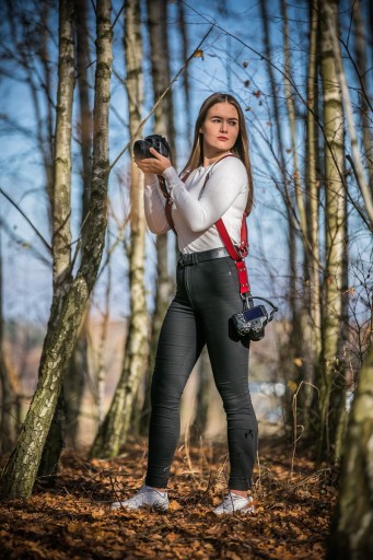 Szelki przeznaczone są dla jednego lub dwóch body. Skóra w kolorze CZERWONYM jest pochodzenia włoskiego, posiada piękną strukturę prawdziwej skóry licowej. Mocowanie aparatu odbywa się przez śrubę uniwersalną 1/4" oraz stalowy karabinek M5, natomiast rolę elementu przesuwnego po skórze pełni stalowy D-ring. Dodatkowym zabezpieczeniem aparatu przed wypięciem jest niezwykle wytrzymała 10mm taśma spięta karabinkiem M4. Długości pasów regulujemy za pomocą szeregu otworków natomiast rozłożenie splotu na plecach za pomocą nabijanego maszynowo nita.