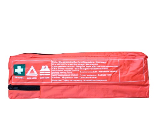 Zestaw samochodowy wyposażony w apteczkę z wkładem DIN 13164, trójkąt i kamizelkę odblaskową, zapakowany w praktyczną, wodoodporną i solidną torbę z rzepami to niezbędny produkt w twoim samochodzie!