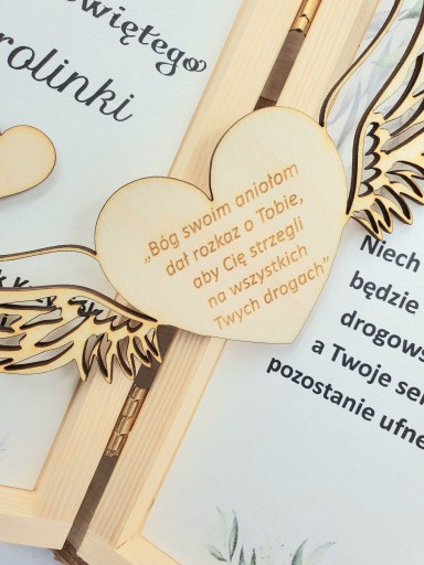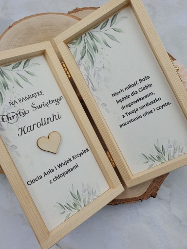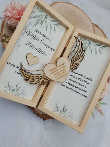 Pudełko zawiera imię dziecka jak i również osób wręczających prezent. Do wyboru maja Państwo również dużą ilość życzeń. Można przesłać własne.