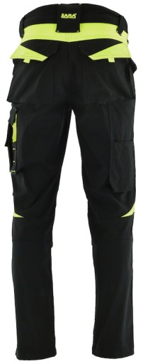 ✅Na dole nogawek spodni znajdują się kontrastowe, ozdobne pasy, a na tylnych karczkach są odcinane, kontrastowe karczki. Na prawej nogawce, poniżej kieszeni, jest naszyta podwójna calówka, a na wysokości kolan znajdują się kontrastowe wstawki. Rozporek przedni jest zapinany na zamek typu “spirala”. Na tylnym pasku znajduje się szeroka szlufka z kontrastowym haftem SARA WORKWEAR, a dodatkowo na całym pasku są cztery węższe szlufki.