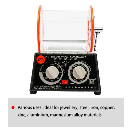 · specjalnie zaprojektowane do wirowania w ustalonym czasie (0-60 minut). Funkcja automatycznego cofania umożliwia bębnowanie z 4 różnymi prędkościami, dzięki czemu biżuteria może być starannie polerowana.