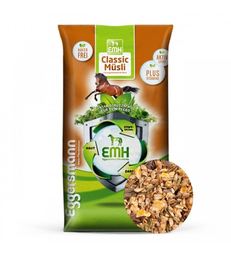 EMH Classic Musli jest wyjątkowo uniwersalnym musli dla wszystkich koni w normalnej pracy. EMH, wchodzący w skład tego smacznego musli, jest ekstraktem ze specjalnie wybranych, wysoce skutecznych ziół sfermentowanych przez mikroorganizmy, o potwierdzonym badaniami korzystnym wpływie na żywienie koni. Poprzez jego dodatek system trawienny nie jest obciążony, a jednocześnie szczególnie wsparty, zatem ilość podawanej paszy treściwej może zostać znacznie zmniejszona.