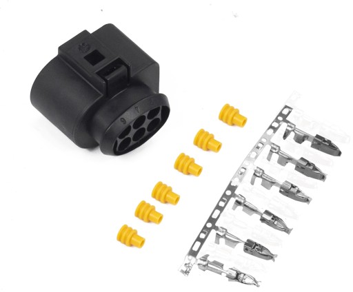 Wtyczka 6-pinowa, 2 rzędowa z samochodów m.in z grupy VAG. W skład zestawu wchodzi wtyczka, terminale oraz gumki zabezpieczające.