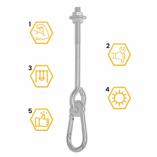 Hak huśtawkowy z karabinczykiem oczkowym to część konstrukcji służący do łączenia dwóch elementów huśtawki lub hamaka podczas montażu. Jest on najczęściej używany w pracach lub projektach ogrodowych.