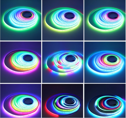 Dzięki połączeniu zalet taśm cyfrowych i technologii COB uzyskujemy wyjątkowo żywe i nasycone kolory z palety tęczy, dobrej jakości kolor biały (zmieszane składowe R+G+B) oraz jednolitą linie świetlną z minimalnie widocznymi punktami świetlnymi ,które znikają przy zastosowaniu nawet płytkiego profilu aluminiowego i klosza mlecznego.