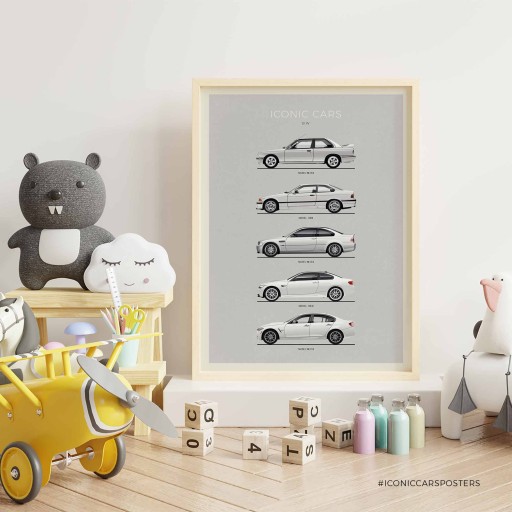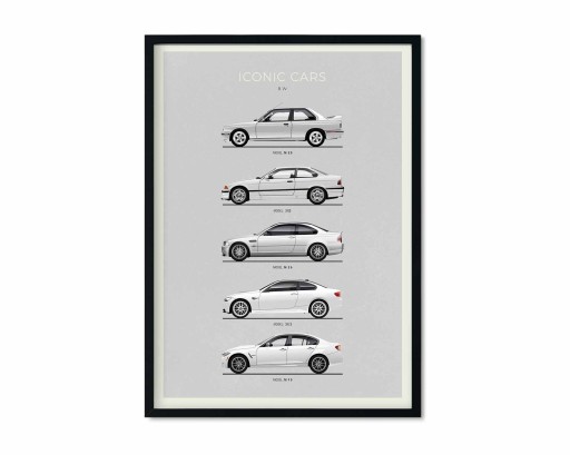 Na plakacie znajduje się modele samochodu marki BMW M3: E30, E36, E46, E92, F80