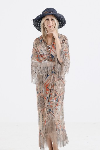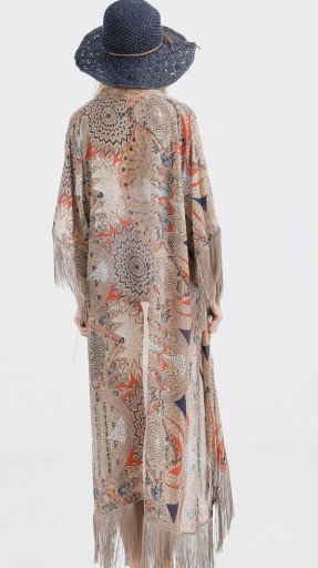Długa szyfonowa narzutka plażowa w stylu boho, etno.