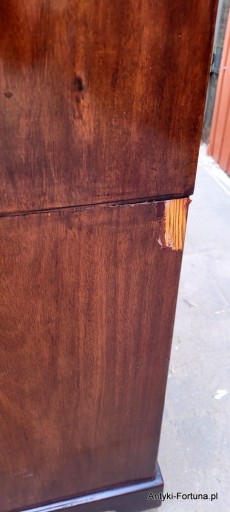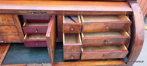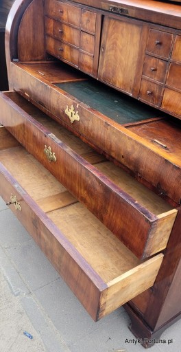 Stara sekretera cylindryczna do renowacji. Stan jak na zdjęciach - ubytki forniru , rysy itp. . Zasuwa cylindryczna sprawna w komplecie 1 klucz do 3 dużych szuflad. Sekretera dzieli się na 2 osobne części . Wymiary : szer 123x59 cm , wys 118 cm , wys do wysuwanego blatu z szufladami 79 cm.