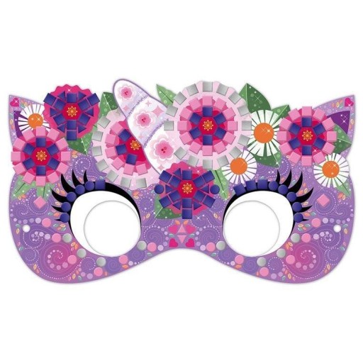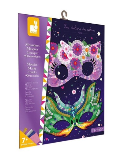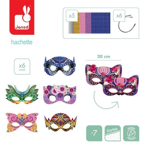 Zestaw kreatywny Mozaika Maski francuskiej marki JANOD zawiera 6 masek z solidnego kartonu – superbohaterów i baśniowych stworzeń. Do masek tych można – zarówno w sugerowanych miejscach, jak i dowolnie – przyklejać dołączone drobne kwadratowe, trójkątne i okrągłe piankowe naklejki (900 sztuk!) w 5 różnych kolorach (różowym, fioletowym, ciemnoniebieskim, złotym i srebrnym), w tym 3 z efektem połysku (każdy kolor znajduje się na osobnym arkuszu). W komplecie jest ponadto 6 gumek do przewiązania przez boczne otwory masek, dzięki którym można je nosić jako przebranie. Naklejanie drobnych elementów to dla dziecka długie godziny angażującej i jednocześnie uspokajającej, wyciszającej zabawy, a gotowe dzieła zapewnią emocjonującą rozrywkę dla kilkorga dzieci, a nawet dla dorosłych.