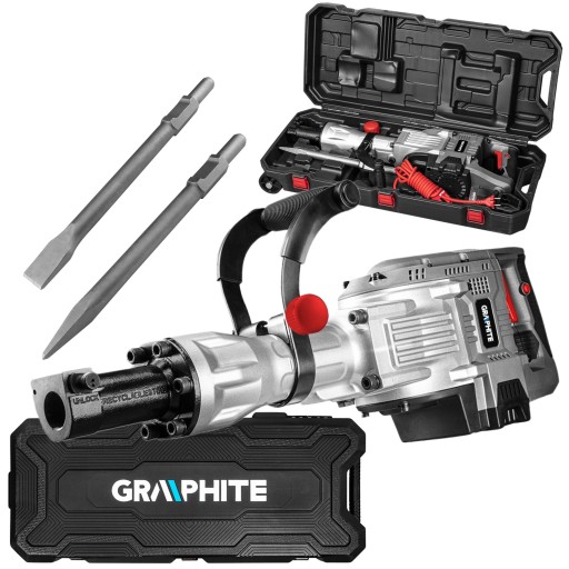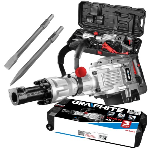 Młot kujący od marki GRAPHITE cechuje się energią udaru 45 J oraz częstotliwością 1500 uderzeń dłuta na minutę. Jego obudowę przekładni wykonano z odpornego na uszkodzenia mechaniczne oraz wysokie temperatury stopu aluminium. Ułatwieniem w użytkowaniu młota jest również włącznik czteropalcowy oraz funkcja blokady do pracy ciągłej.