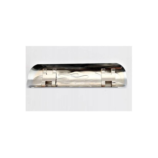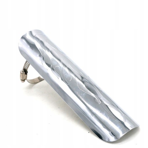 Osłona rury wydechowej z motywem płomienia, wykonana z metalu dostępna w kolorze chrom .W komplecie dwie obejmy o średnicy 7 cm. Na innych moich aukcjach różne modele osłon.Wymiary na zdjęciu.