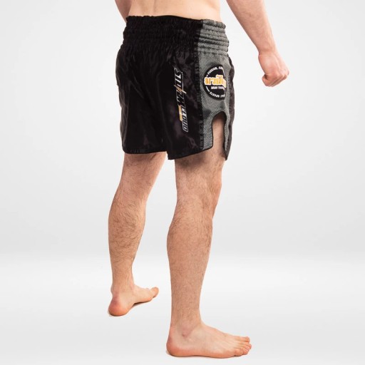StormCloud Spodenki Muay Thai Classic Czarne/Szare przeznaczone są do treningu tajskiego boksu. Krótkie nogawki i wycięcia po bokach umożliwiają swobodne wyprowadzanie kopnięć. Elastyczny pas zapewnia dopasowanie i zapobiega przesuwaniu się spodenek. Spodenki Muay Thai wykonane zostały z gładkiej satyny i materiału mesh po bokach spodenek. Całość ozdabiają logotypy marki StormCloud.