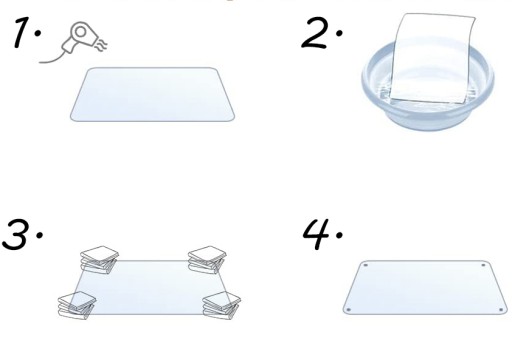 2. Umieścić matę w ciepłej wodzie na kilka minut, następnie osuszyć i wygładzić powierzchnię maty umieszczonej na twardej powierchni