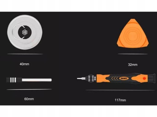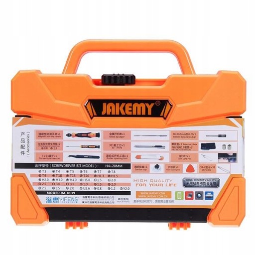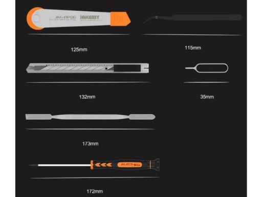 to oryginalny produkt renomowanej firmy JAKEMY służący do serwisowania telefonów, smartfonów, tabletów, nawigacji i innego sprzętu elektronicznego. Na zestaw składa się komplet końcówek, nasadki, torx, przedłużka do wkrętaka, nożyk, przyssawka do zdejmowania ekranów i obudów, podważak, otwierak z obrotowym kołem do demontowania obudów, igłę, pensetę, piórko i multifunkcyjny wkrętak.