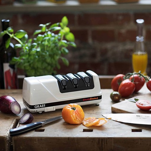 Ostrzałka jest bezpieczna dla noży każdej jakości, dzięki minimalnemu ścieraniu materiału noża oraz precyzyjnemu pozycjonowaniu ostrza, możliwemu dzięki prowadnicy kątowej z elastomeru.