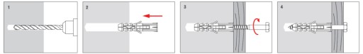 - Do wywierconego otworu wprowadzany jest kołek, a wkręt jest wkręcany poprzez element mocowany aż do momentu jego pełnego zagłębienia się w koszulce (montaż wstępny)