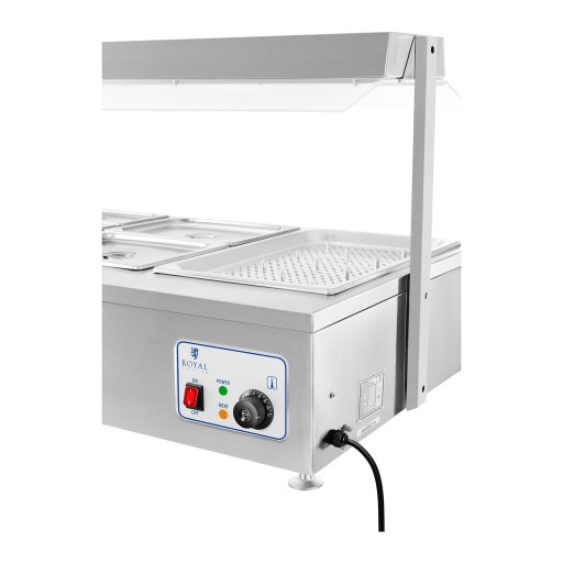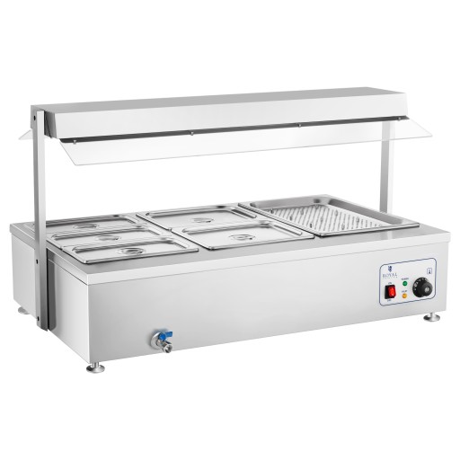 Profesjonalny bemar marki Royal Catering to niezawodny produkt, którego nie powinno zabraknąć na wyposażeniu żadnego hotelu, restauracji, baru szybkiej obsługi, kantyny czy bufetu. Sprzęt umożliwiający podgrzewanie i utrzymywanie optymalnej temperatury dań i przekąsek dysponuje wydajnym elementem grzewczym oraz lampą halogenową z trzema żarówkami. 6 pojemników GN pozwala serwować spore ilości potraw i przekąsek, np. ziemniaków, mięs, wędlin, sosów, zup, gulaszy, ryżu