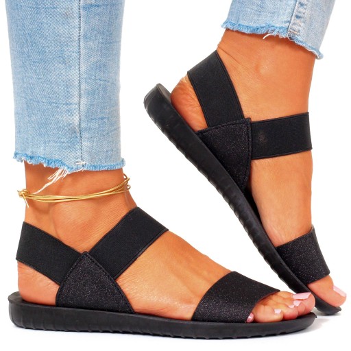 Damskie sandały w kolorze czarnym na płaskim spodzie. Sprawdzą się zarówno jako obuwie na co dzień w letnie, upalne dni oraz jako obuwie na specjalne okazje. Prosty fason dopasuje się wielu stylizacji a brokatowe wykończenie doda uroku każdej z nich. Gumowe paski przy pięcie i kostce ułatwia zakładanie obuwia oraz dopasowanie do stopy.