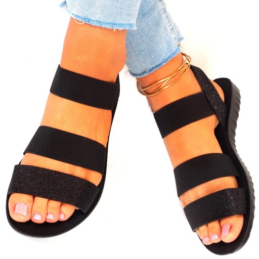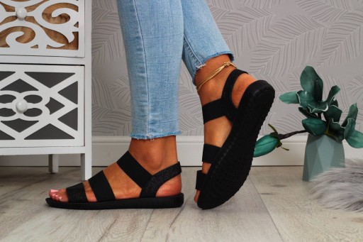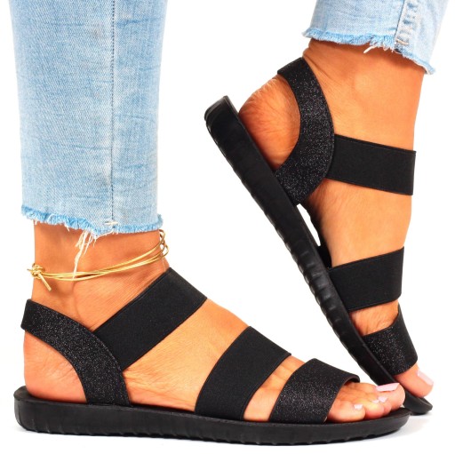 Damskie sandały w kolorze czarnym na płaskim spodzie. Sprawdzą się zarówno jako obuwie na co dzień w letnie, upalne dni oraz jako obuwie na specjalne okazje. Prosty fason dopasuje się wielu stylizacji a brokatowe wykończenie doda uroku każdej z nich. Gumowy pasek przy kostce ułatwia zakładanie obuwia oraz dopasowanie go do stopy.