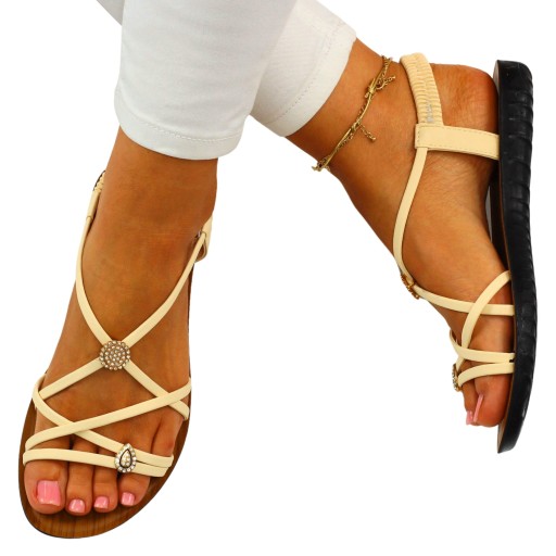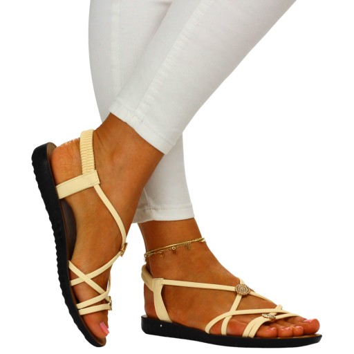 Damskie sandałki w kolorze beżowym na płaskim spodzie. Idealnie sprawdzą się jako obuwie na co dzień w letnie, upalne dni. Prosty fason dopasuje się również do eleganckich stylizacji a ozdobne koraliki dodadzą uroku każdej stylizacji. Elastyczny pasek przy pięcie ułatwia zakładanie obuwia i ułatwia jego dopasowanie do stopy.
