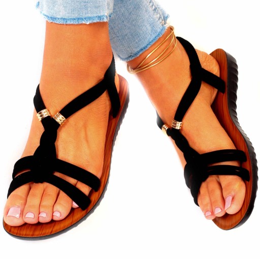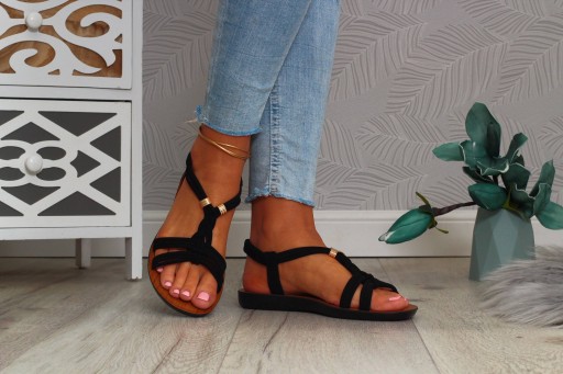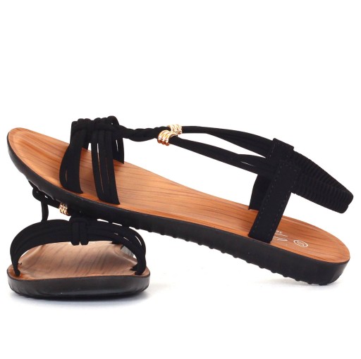 Damskie sandałki w kolorze czarnym na płaskim spodzie. Idealnie sprawdzą się jako obuwie na co dzień w letnie, upalne dni. Prosty fason dopasuje się również do eleganckich stylizacji a ozdobne koraliki dodadzą uroku niejednej stylizacji. Elastyczny pasek przy pięcie ułatwia zakładanie obuwia i ułatwia jego dopasowanie do stopy.