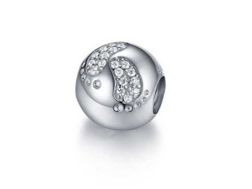 Elegancki wykonany z rodowanego srebra charms pasujący do bransolet modułowych, o kształcie kulki zdobionej wysadzanymi białymi cyrkoniami dziedzęcymi stopkami.