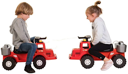 Jeździk bardzo przypomina prawdziwy wóz strażacki, nie tylko swoim wyglądem, również dzięki zamontowanej obrotowej armatce wodnej, która sprawi że każde dziecko poczuje się jak strażak. Ogromny wóz strażacki idealny do zabawy w domu i na zewnątrz. Dziecko może korzystać z pojazdu, jak z jeździka. Ponadto armatka psikająca wodą i ruchome elementy zapewnią maluchowi wiele frajdy i ruchowej zabawy. Maluszek może skierować obrotową sikawkę, w miejsce, które chce ugasić i zacząć psikać wodą, pompując ją za pomocą wygodnej pompki znajdującej się z przodu siedziska. Armatka wodna znajduje się z przodu pojazdu, podłączona rurka łączy armatkę ze zbiornikiem, który umieszczony jest za siedziskiem.