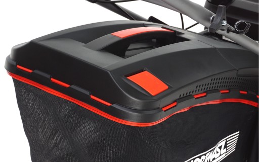 - Duży z wygodnym uchwytem, parciano-plastikowy. Górna część kosza wykonana z plastiku dobrze chroni obsługującego przed kurzem, dolna - wykonana z tkaniny zapewnia maksymalną przepustowość powietrza dzięki czemu następuje pełne wypełnienie pojemnika koszoną trawą.