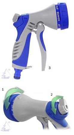Pistolet 8-funkcyjny do podlewania, zraszania. Pozwala podlewać różnymi strumieniami wody: od skoncentrowanego do rozproszonej mgiełki. Blokada (1) pracy ciągłej przy wybranym strumieniu . Pistoletowy ma ergonomiczny (3) spust umożliwiający zamykanie i otwieranie strumienia. Wykonany w połączeniu z elastycznym antypoślizgowym tworzywem. Możliwość regulacji natężenia strumienia wody (2)