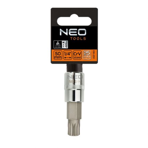 Końcówka Spline na nasadce 1/2" NEO (nr ref. 08-735) o rozmiarze M14, długości 55 mm. Nasadka wykonana z wytrzymałej stali chromowo-wanadowej. Końcówka sześciokątna z wysokogatunkowej stali stopowej S2. Marka NEO spełnia oczekiwania profesjonalistów