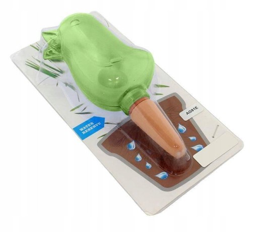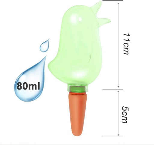 - Łatwe w użyciu - wystarczy zalać wodę przez otwór w dziobie i wbić nawadniacz do ziemi w doniczce (w zależności od kwiatka nawadniacz może działać do 7 dni).