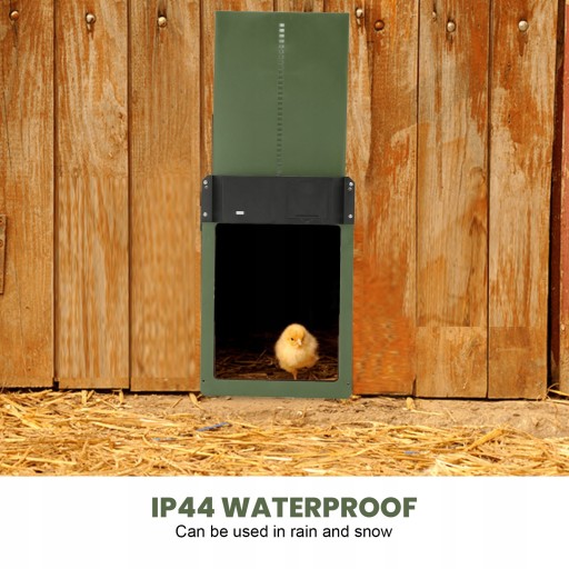 3. WYTRZYMAŁOŚĆ I WODOODPORNOŚĆ: Ulepszona konstrukcja ramy drzwi kurnika w celu zmniejszenia zacięć podczas automatycznego podnoszenia. Wodoodporność IP44 na deszczowe i śnieżne dni.