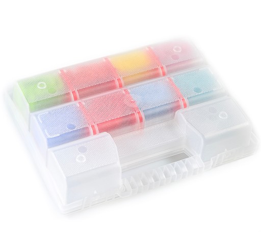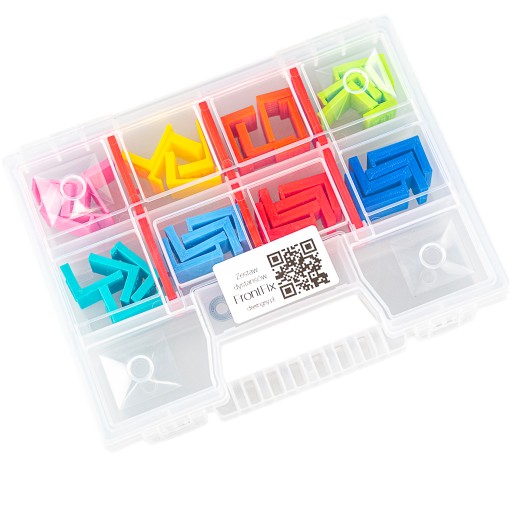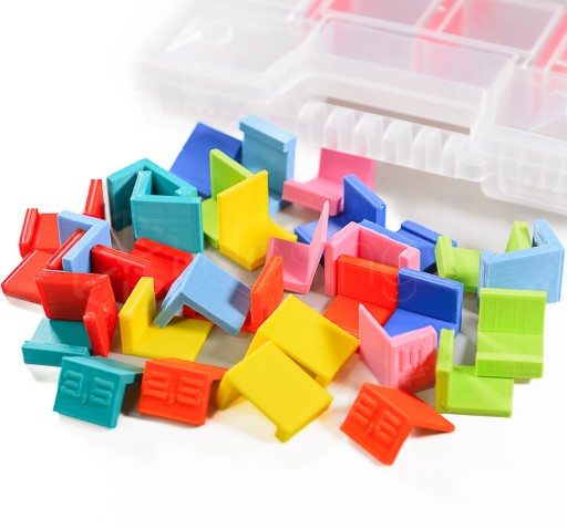 Organizer oraz zestaw różnokolorowych, drukowanych dystansów, ułatwiających regulację frontów.
