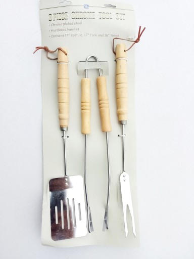 3 częściowy zestaw akcesoriów do grilla – Akcesoria wykonane są z wysokiej jakości stali chromowanej, a ich uchwyty wyprofilowane i drewniane, aby zapobiec nagrzewaniu oraz zapewnić pewny chwyt. Widelec i łopatka zostały również wyposażone w rzemyk umożliwiającą zawieszenie narzędzia.
