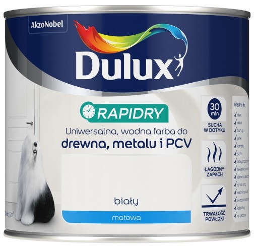 Dulux Rapidry to najwyższej jakości, szybkoschnąca, wodna farba do drewna, metalu i PCV.
