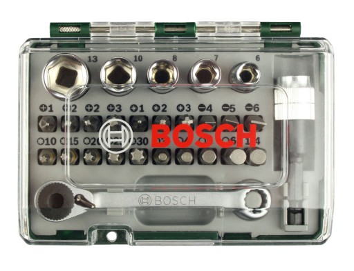27 częściowy zestaw bitów i nasadek BOSCH w trwałej kasecie z tworzywa sztucznego.