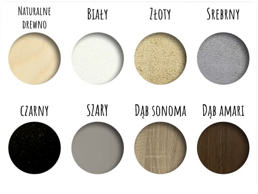 - Możesz wybrać kolor: naturalne drewno, biały, złoty, srebrny, czarny.