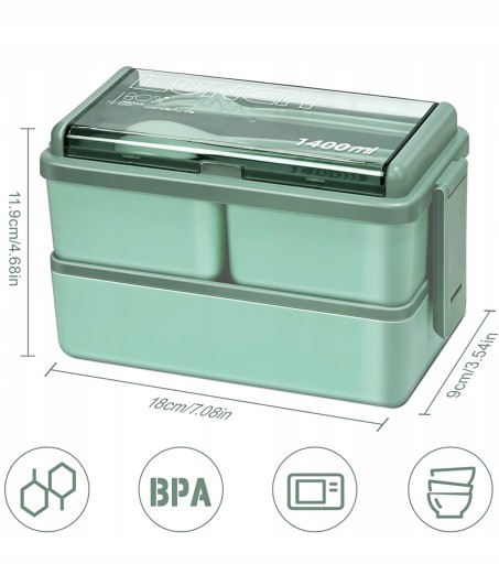 Dwuwarstwowe pudełko na lunch dla dzieci ma dużą pojemność 1400 ml. Pierwsza warstwa to połączenie dwóch pojemników o pojemności 350ml, druga warstwa to pojemnik o dużej pojemności 700ml, a także osobne miejsce na łyżki i widelce.