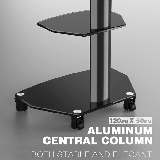 - Bardziej stabilny – ten zwijany stojak na telewizor z kółkami jest wykonany z aluminiowych kolumn, które są mocniejsze, dzięki czemu mogą wytrzymać telewizory do 50 kg. Półki ze szkła hartowanego zapewniają miejsce do przechowywania akcesoriów audio-wideo, odtwarzaczy Blu-Ray i DVD, konsoli do gier, soundbarów itp.
