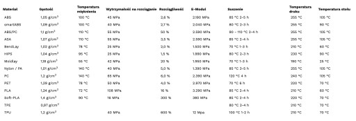 - Filament 3D - rodzaj: PLA / PHA, Nylon, ABS / ABS+ / smartABS, PET / PET-G, nGEN, TPU, ASA, HiPS, HT, MATT, PA-CF, PC, PCL, PMMA, PVA, SILK, XT