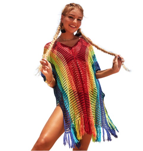 Letnia pleciona tunika w stylu boho w tęczowych kolorach.