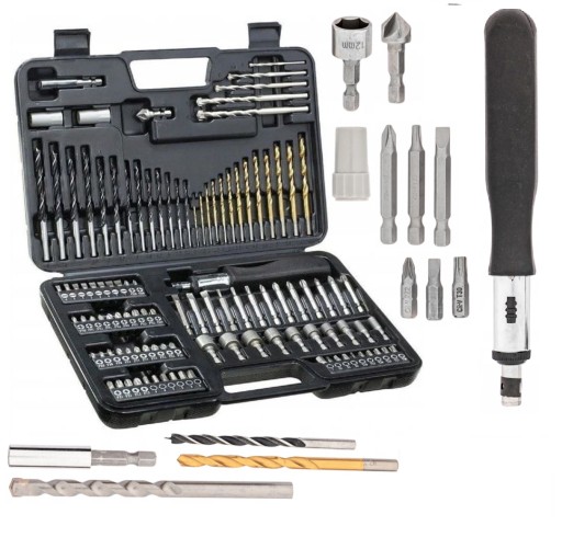 Zestaw 109 sztuk narzędzi, składający się z wierteł do metalu, drewna i muru, końcówek 1/4" do różnych śrub, adaptera magnetycznego oraz nasadek do śrub z łbem sześciokątnym.