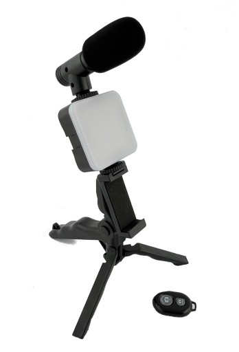 Kompletny zestaw do smartfonów, VLOGone, dzięki któremu z łatwością przeprowadzisz rozmowę w sieci, nagrasz wywiad lub profesjonalny film. Swietnie sprawdzi się w czasie zdalnych rozmów rekrutacyjnych, lub codziennej pracy. Zestaw VLOGone składa się z Mikrofonu, który łączy się ze smartfonem za pośrednictwem dołączonego do zestawu kabla 3,5mm. Dołączona do zestawu lampa LED umożliwia ustawienie oświetlenia w trzech różnych zakresach. Całość w prosty sposób łączy się ze statywem, który umożliwia korzystanie stacjonarne lub złożenie statywu w sposób umożliwiający wygodne przenoszenie całego zestawu z ciągłą możliwością nagrywania. Dodatkowo zestaw wyposażony został w pilota, który łączy się ze smartfonem za pośrednictwem bluetooth. Pilot daje możliwość uruchomiania trybu nagrywania video lub pełni rolę wywoływacza w trybie robienia zdjęć.