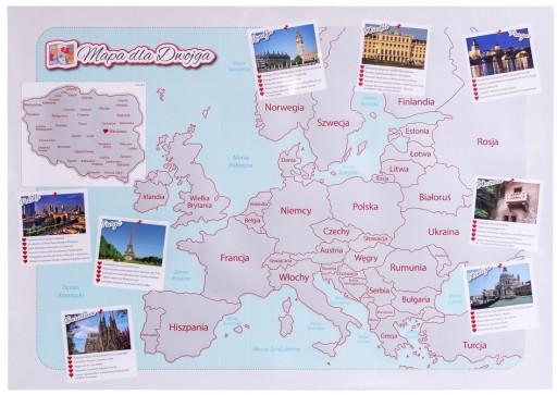 ⭐ Mapa dla Dwojga o rozmiarze 864 x 606 mm zawiera mapę Europy i wyszczególnia romantyczne miejsca, takie jak Paryż czy Wenecja. Ponadto zawiera propozycje ponad 40 niezwykłych doświadczeń, o które warto zadbać w wybranych miejscach Europy.