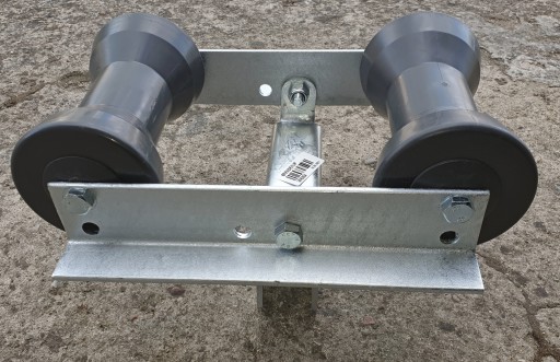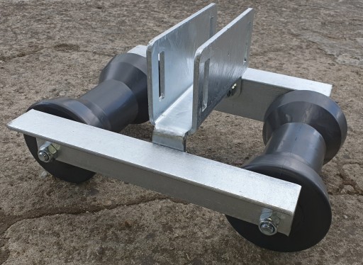 Wózek dwurolkowy z rolkami kilowymi widoczny na poniższym zdjęciu (przykręcony do poprzeczki ramy przyczepy)