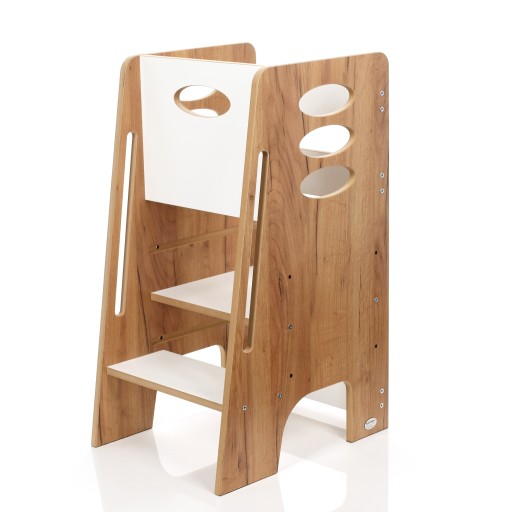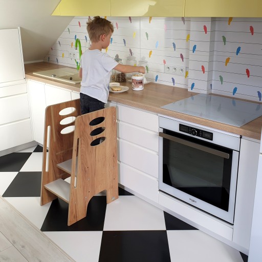 Nasz kitchen helper to solidny produkt, który jest w całości produkowany w Polsce. Zbudowaliśmy go z laminowanych płyt MDF, dzięki czemu jest stabilny i bezpieczny. Całość została ręcznie wykończona, aby żadna ostra krawędź lub wystająca drzazga nie zagrażały maluchowi.