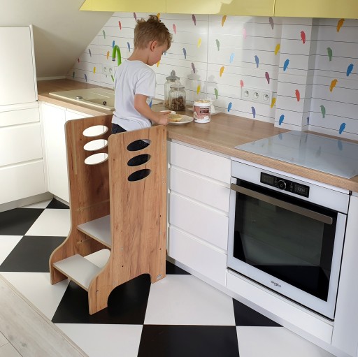 Nasz kitchen helper to solidny produkt, który jest w całości produkowany w Polsce. Zbudowaliśmy go z laminowanych płyt MDF, dzięki czemu jest stabilny i bezpieczny. Całość została ręcznie wykończona, aby żadna ostra krawędź lub wystająca drzazga nie zagrażały maluchowi.